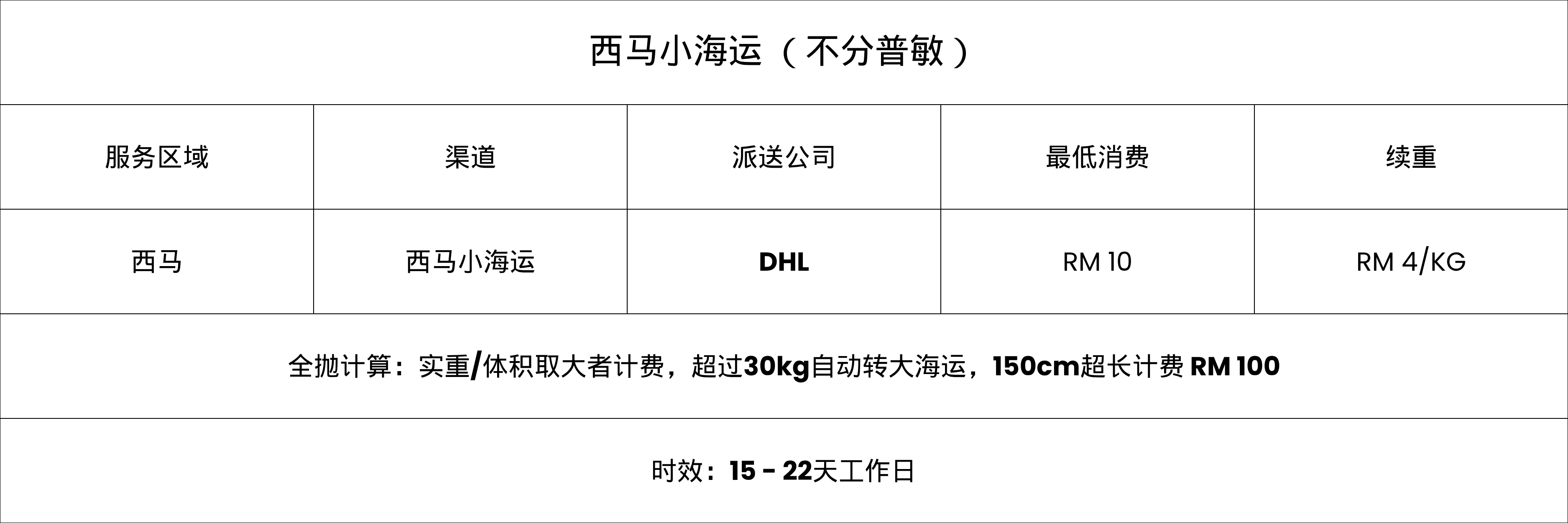 全抛计算:实重/体积取大者计费,超过30kg自动转大海运,150cm超长计费 RM 100